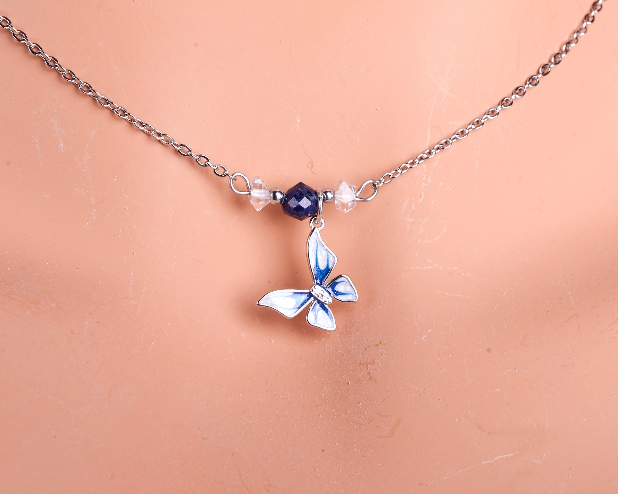 Genuine Azurite NY Herkimer Diamond sterling silver blue Butterfly charm necklace