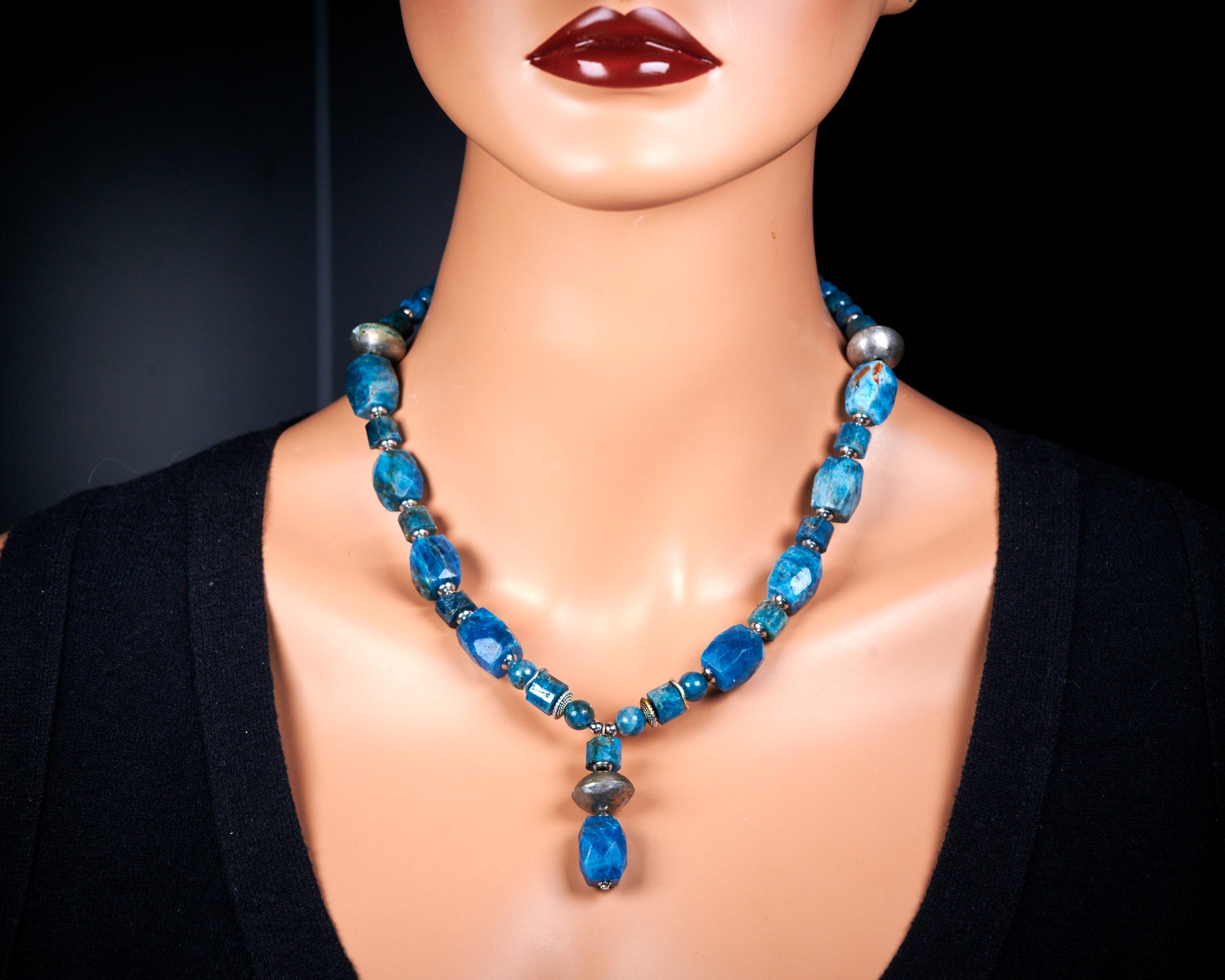 Genuine untreated lake blue Apatite handmade African silver beads necklace. Natural Apatite silver pendant