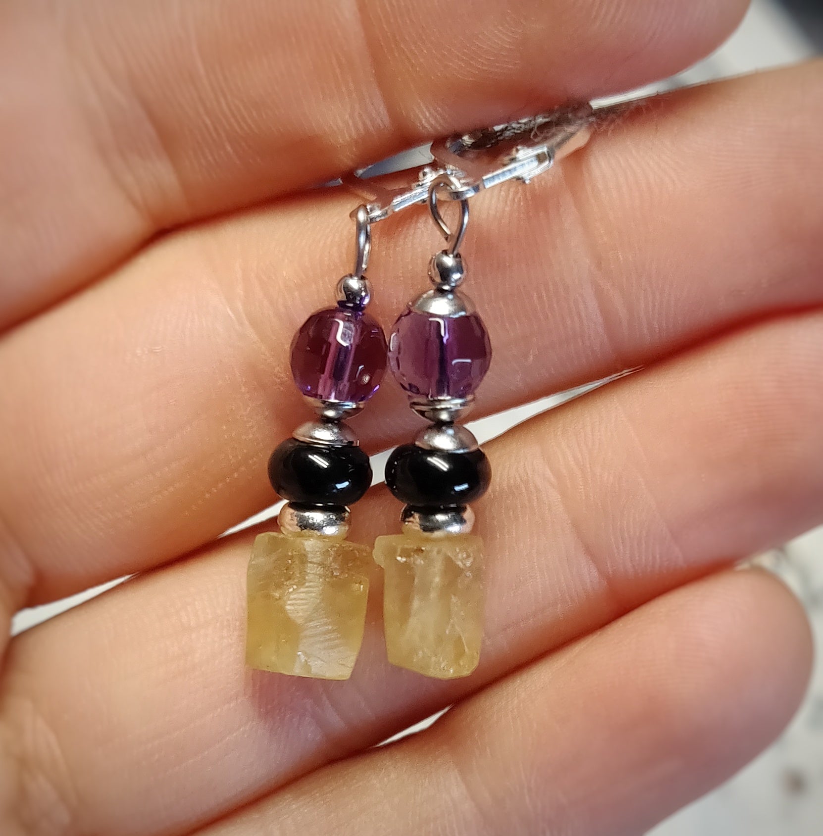 Genuine Citrine black tourmaline amethyst sterling silver earrings