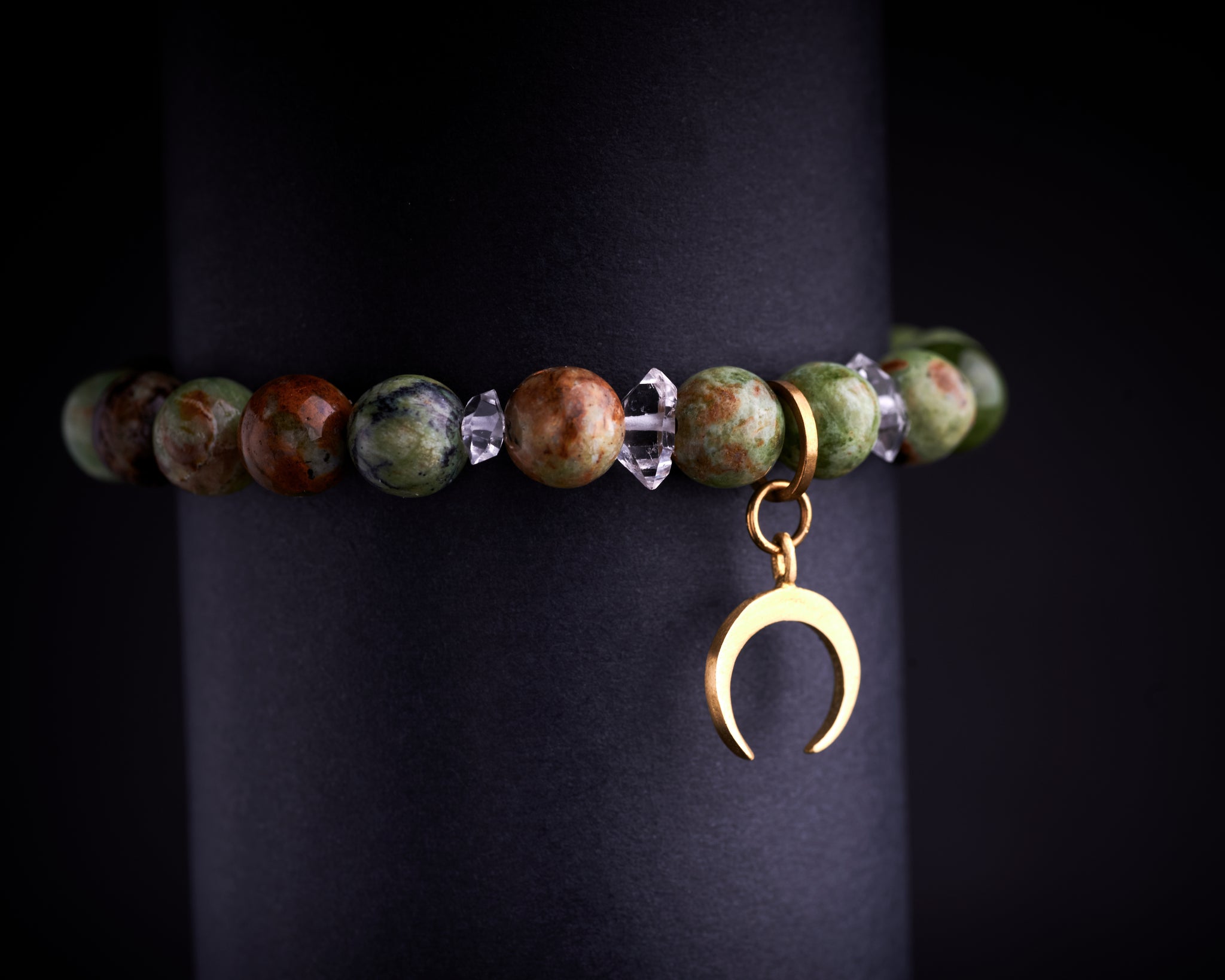 Genuine untreated green multi color Opal 8mm raw NY Herkimer diamond solid brass crescent moon charm stretch bracelet