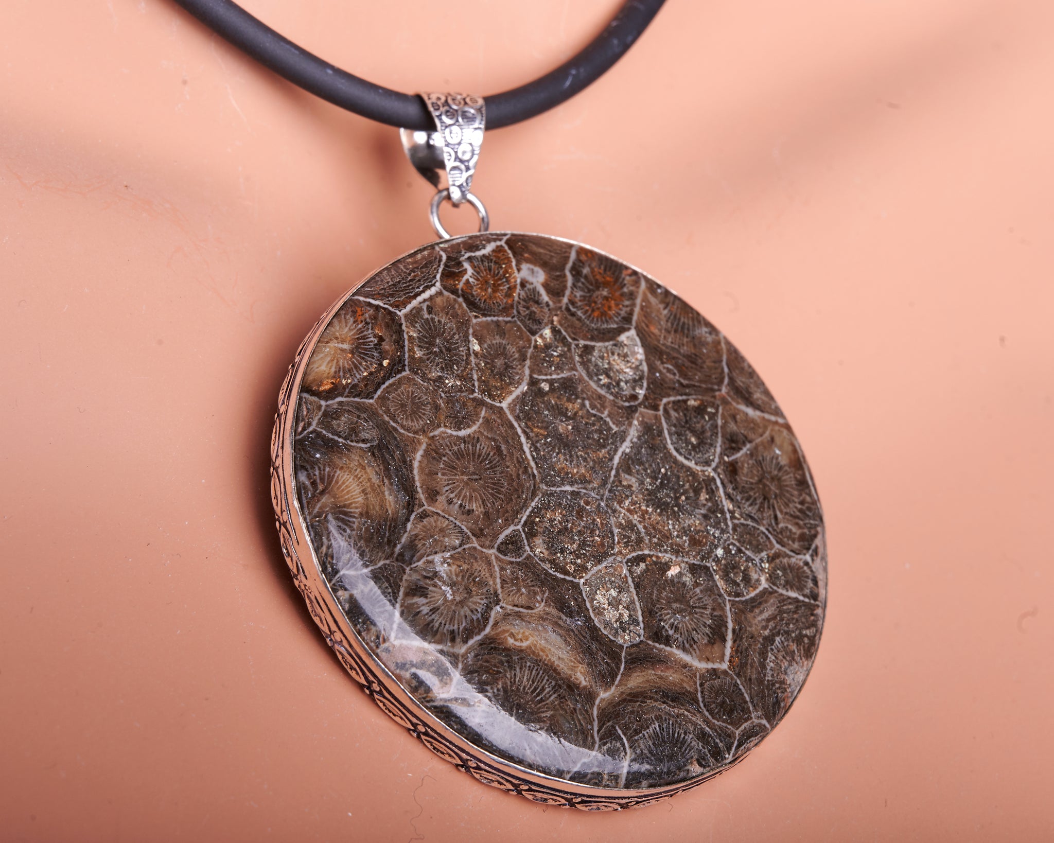 Huge 10cm Coral Fossil sterling silver plated round Pendant on black leather cord