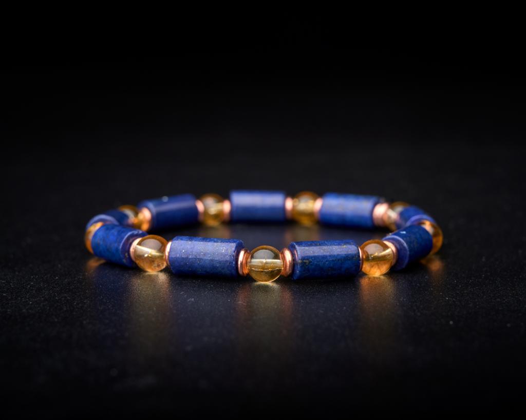 Genuine blue Lapis Lazuli 12mm, yellow Citrine 6mm, solid copper stretch bracelet
