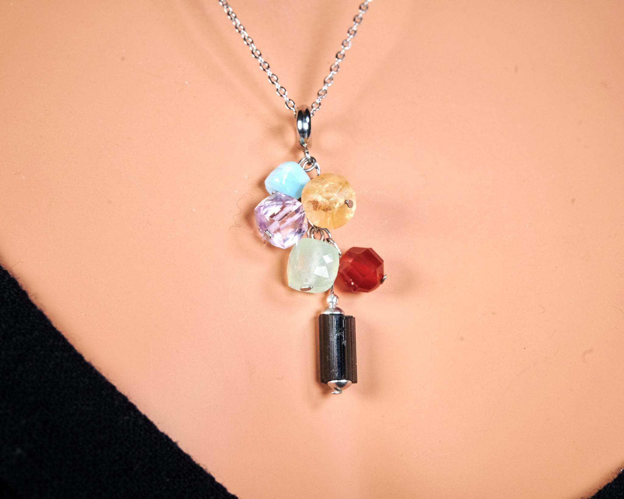 Empath protection necklace. stone rough black Tourmaline blue Larimar yellow Citrine purple Amethyst light green Prehnite orange Carnelian gemstone pendant