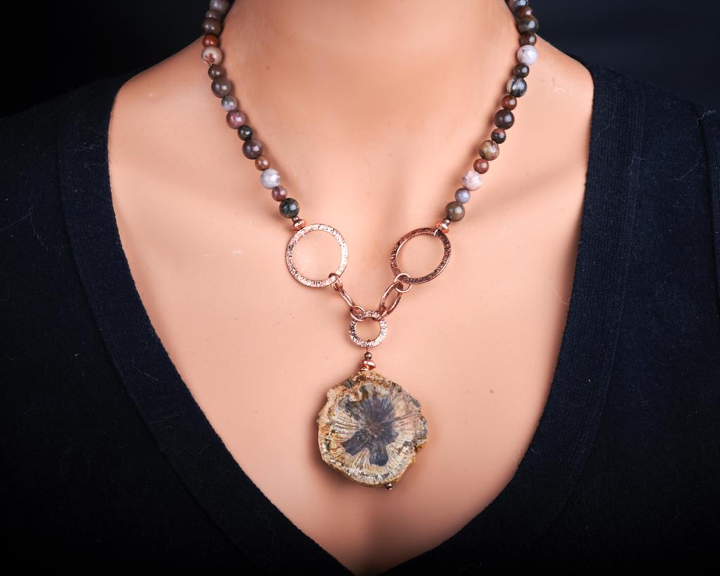 Genuine natural Petrified Wood 8mm and 6mm solid copper necklace, genuine raw Petrified Wood slice pendant