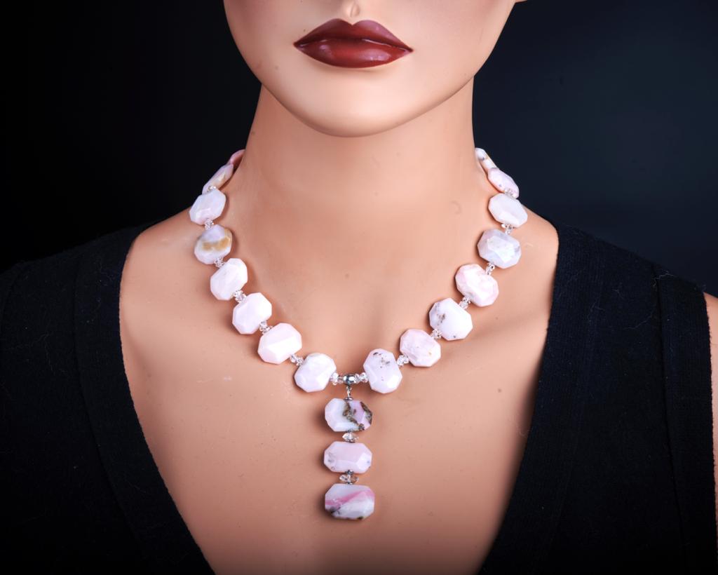 Genuine untreated Pink Opal raw NY Herkimer Diamonds statement beaded necklace with pendant