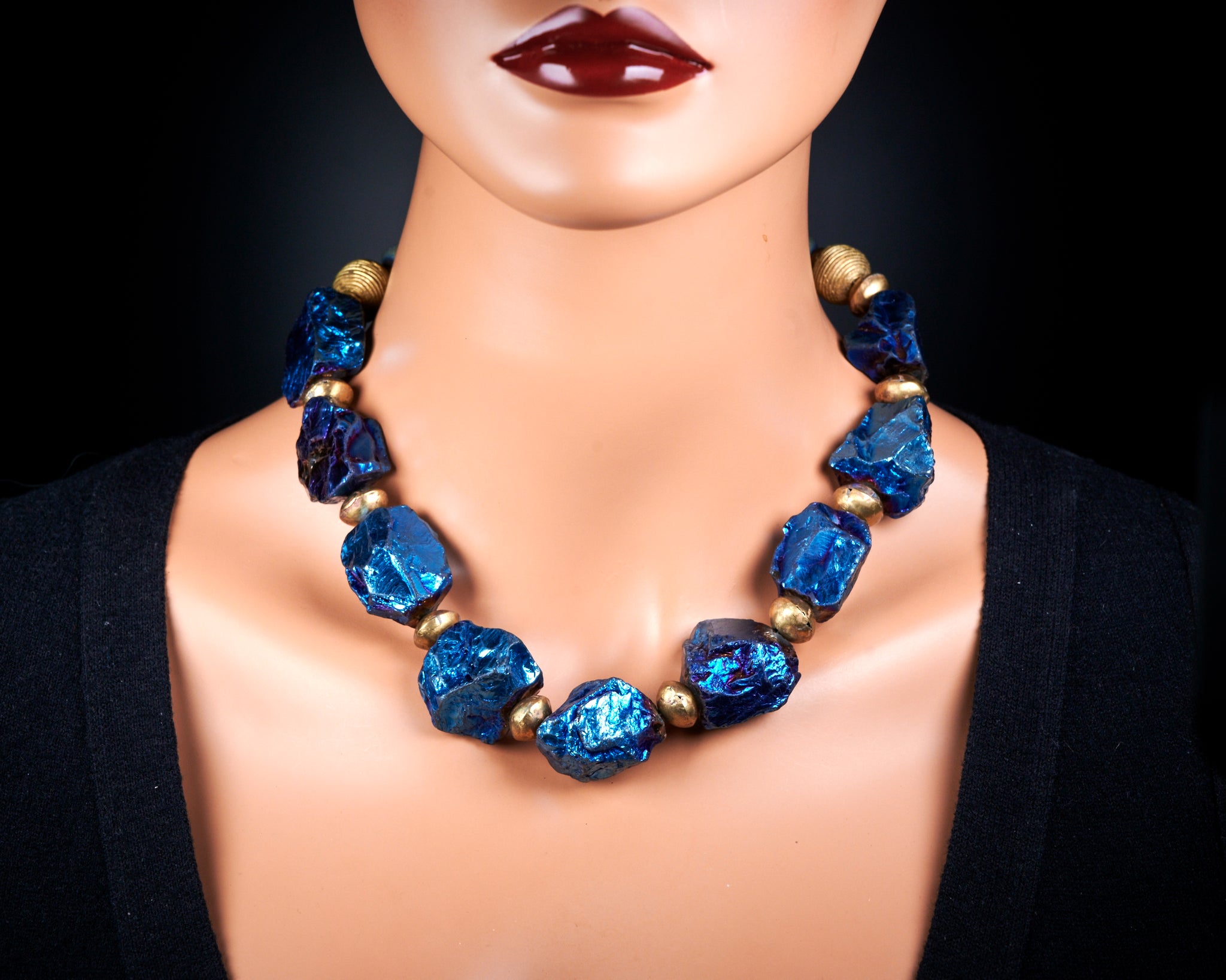 Electric blue Titanium coated natural rough raw Agate druzy gemstone handmade African brass beads necklace.