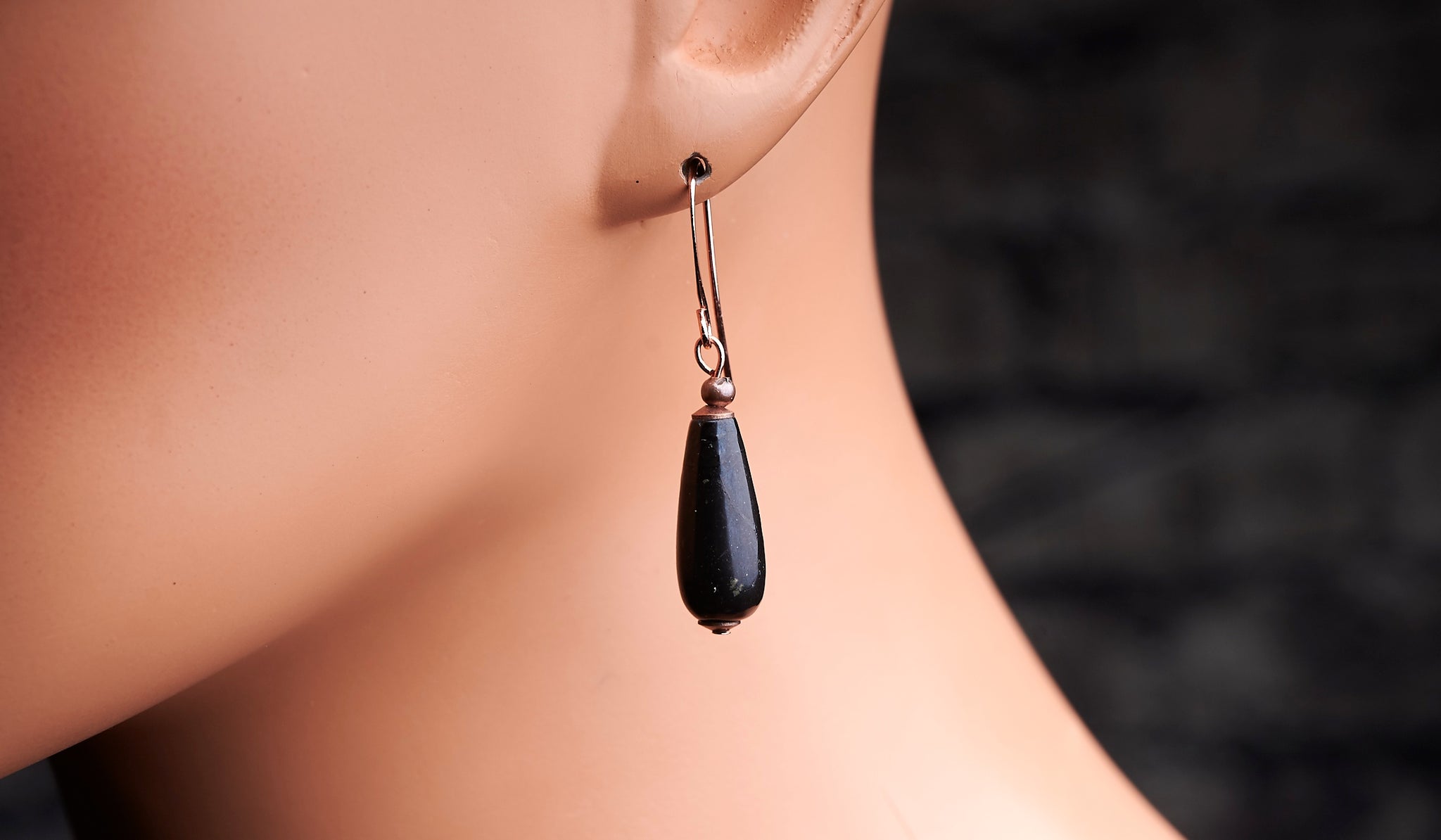 Natural untreated Russian Karelian black Shungite teardrop raw copper earrings 28mm long. Black shungite teardrops 20mm