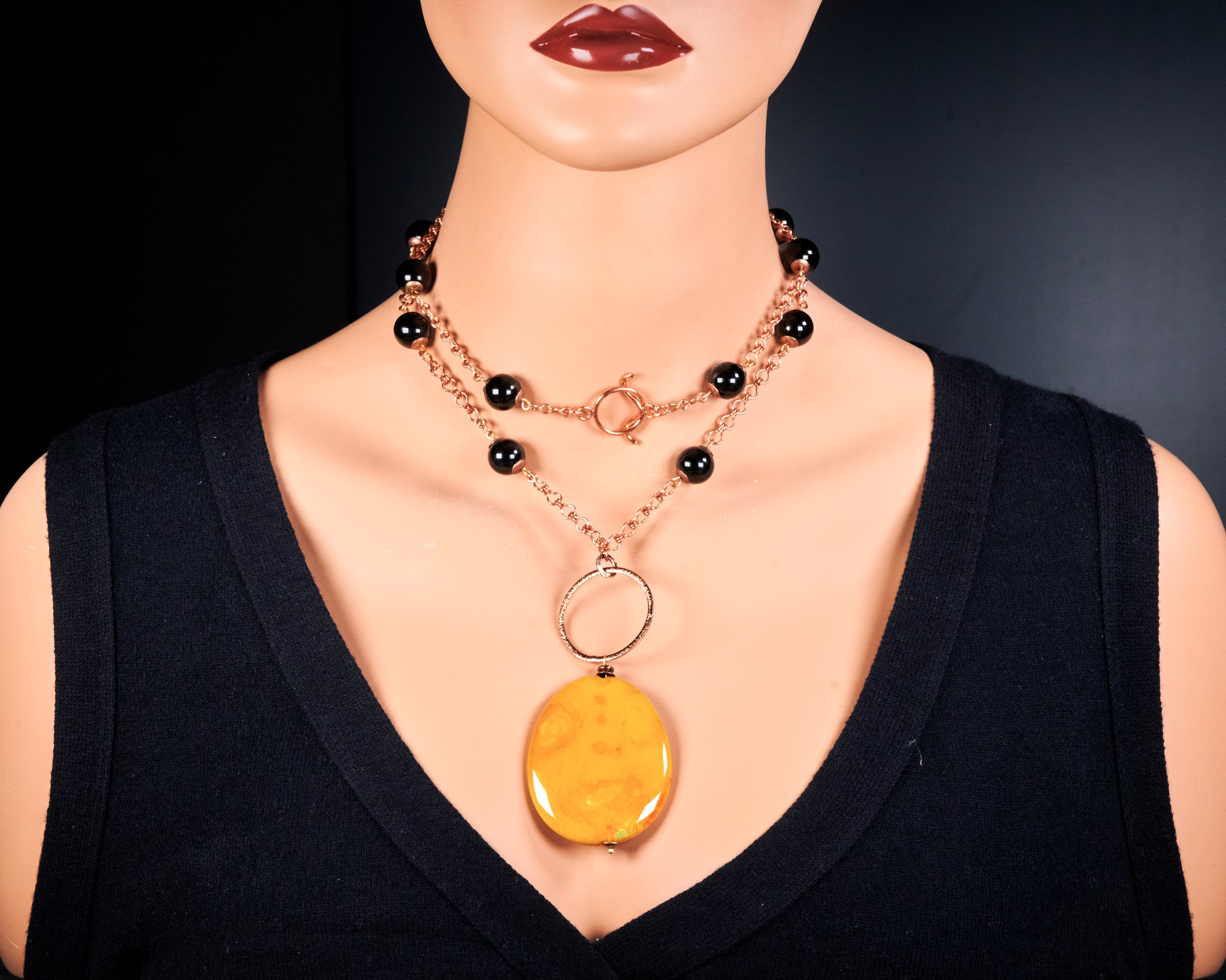Huge big statement Genuine untreated Yellow Agate pendant black Onyx solid Copper long 35" necklace
