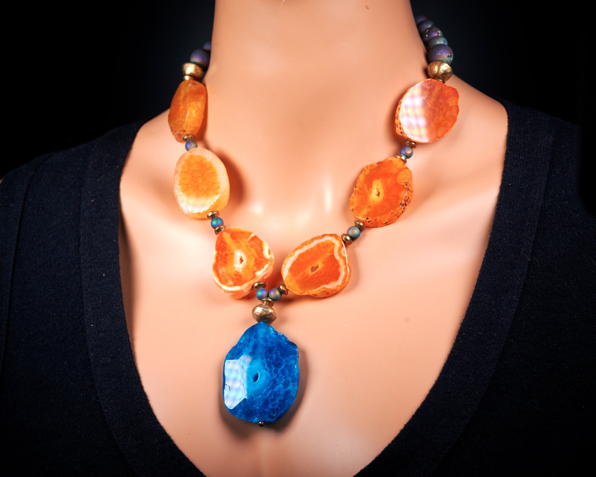 Statement big huge Natural blue orange slab slice titanium multi color agate handmade African brass beads beaded necklace. Blue slice pendant